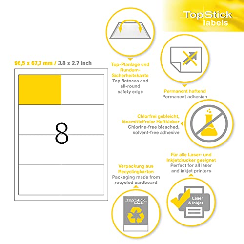 Fornitura: 8000 x TopStick etichette, formato A4, 9,65 x 6,77 cm, rettangolari, bianche (1000 fogli da 8 etichette ciascuno)