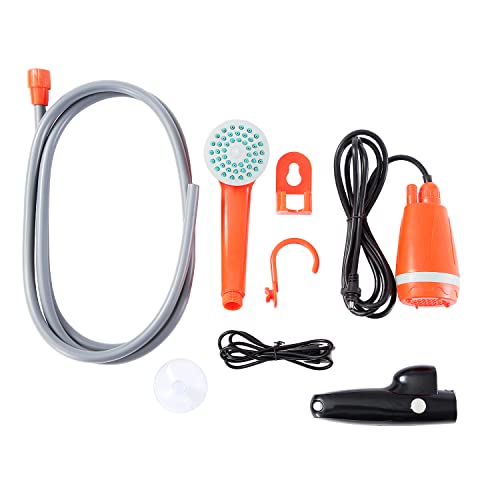 Specifiche: Tensione: 3,7 V, Elettricità: 3 A, Potenza: 25 W, Lunghezza del tubo: 2 M/6,5 piedi, Lunghezza del cavo: 2 M/6,5 piedi, il kit doccia da campeggio per esterni è composto dagli accessori necessari per la doccia, adatti per il campeggio, la nautica, pesca, pulizia animali domestici, lavaggio auto ecc