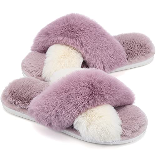 Topwolve Pantofole Peluche Donna Invernali Comode Ciabatte da Casa Antiscivolo Punta Aperta Fluffy Infradito Moda Warmer Piatte Slippers Bianco Viola 42/43EU