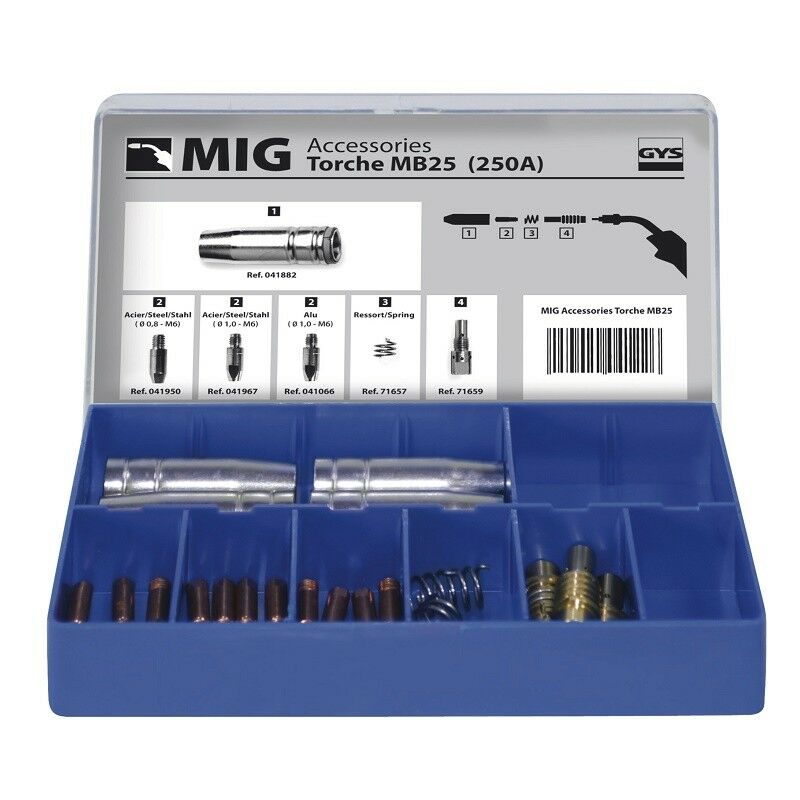 Dettagli: Tutti i materiali di consumo essenziali per la torcia MIG 250A in una scatola: - 5 tubi di contatto Ø0,8 M6 acciaio/acciaio inox - 5 tubi di contatto Ø1 M6 acciaio/acciaio inox - 5 tubi di contatto Ø1 M6 Alu - 3 supporti per tubi di contatto - 5 molle degli ugelli - 3 ugelli