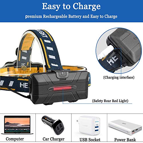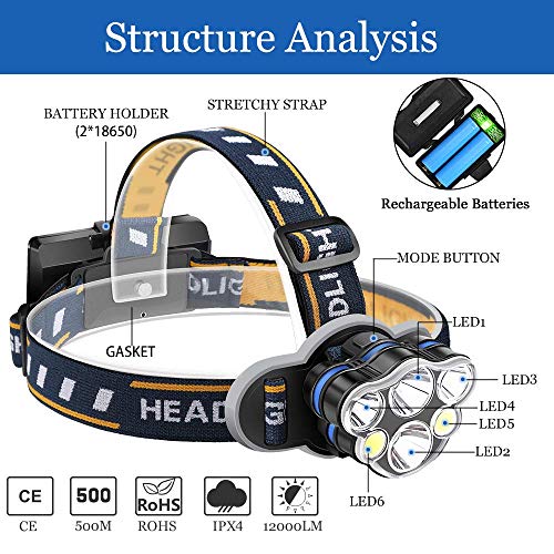 Torcia Frontale,Qooner 12000 Lumen 6 LED ultra luminosi Lampada frontale con batterie ricaricabili USB, 8 modalità Lampada frontale impermeabile per ciclismo Campeggio Pesca Escursionismo Jogging