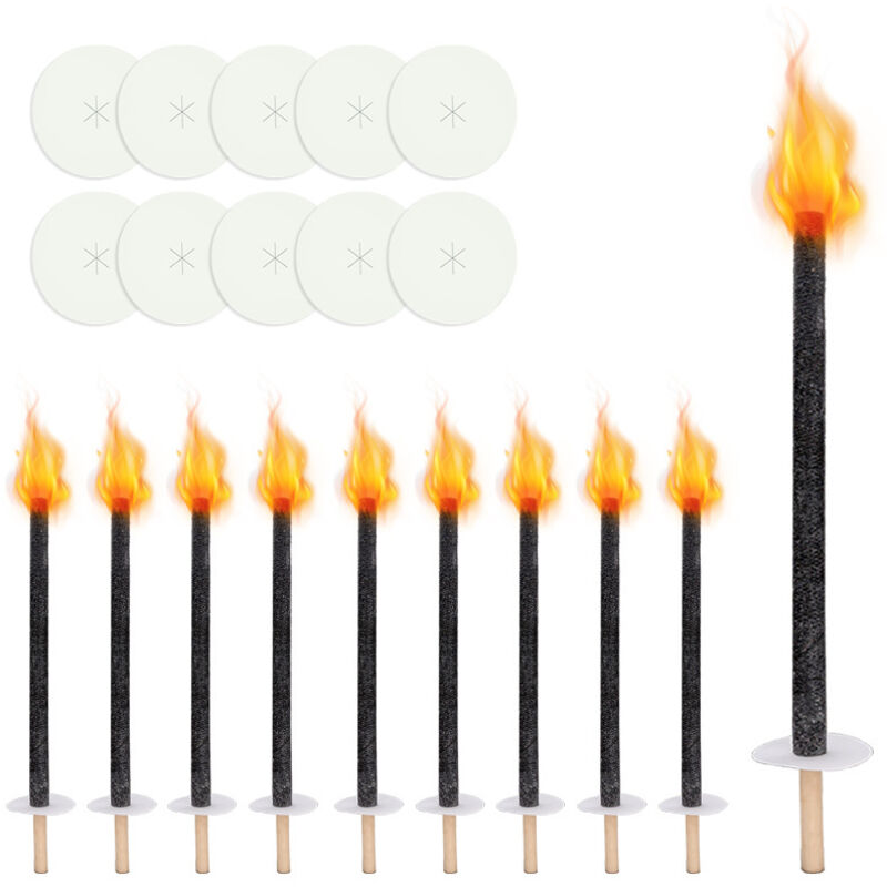 Questa confezione contiene 10 torce di cera con una durata di combustione di circa 90-100 minuti in condizioni ideali. Queste torce di cera sono costituite da un legno bordato attorno al quale viene avvolto un panno imbevuto di cera. Il panno imbevuto di cera è anche il corpo incandescente della torcia. Tutte le torce sono dotate di una protezione antigoccia fissata alla base della torcia. in modo che la cera non goccioli sulla mano quando la torcia viene tenuta in mano. Il tempo di combustione ideale si ottiene quando la torcia è tenuta in verticale e non c'è vento. Se la torcia viene tenuta inclinata. il tempo di combustione sarà più breve. Il tempo di combustione può essere ridotto anche in condizioni di vento. in quanto la fiamma viene raggiunta da una maggiore quantità di ossigeno. √Con protezione antigoccia e manico lungo per proteggere le mani. √Non ci sono materiali nocivi. non si sviluppa fuliggine. le torce non cadono a pezzi quando bruciano. √Particolarmente facile da
