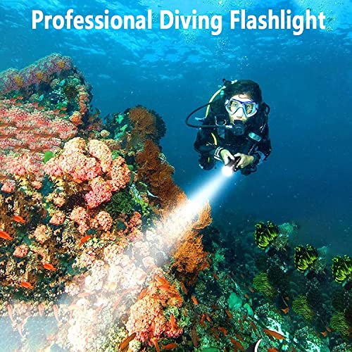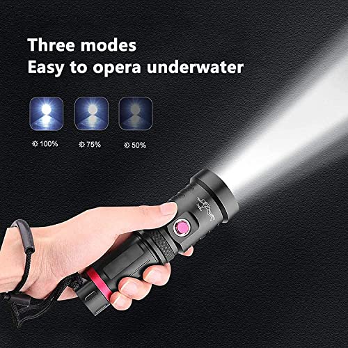 【Super Bright】-- Una torcia subacquea affidabile è un compagno essenziale per i subacquei. Dotato di lampadina LED XHP70 con una potenza massima di 6000 lumen e 50.000 ore di durata del LED. 3 modalità di illuminazione: Luce alta - Luce media - Luce bassa.