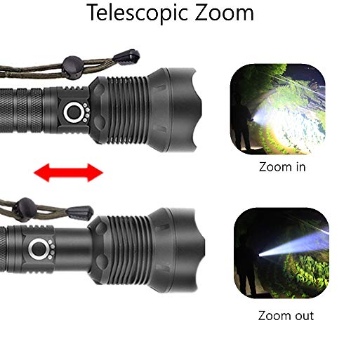 Torcia LED Ricaricabile Super Luminoso XHP70 Torcia Tattica Militare LED Messa a Fuoco Regolabile 5 Modalità Torcia Portatile Impermeabile con 26650 Batterie per Campeggio Escursionismo Emergenza