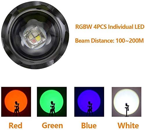 La torcia a LED RGBW 4 in 1 ha 4 sorgenti luminose a LED individuali (rosso, verde, blu, bianco), che hanno un'elevata luminosità, distanza del raggio fino a 100 ~ 200 metri, una torcia soddisfa le diverse esigenze. L'ultimo XML 4 in 1 ha portato a produrre fino a 800 lumen di luminosità luminosa.