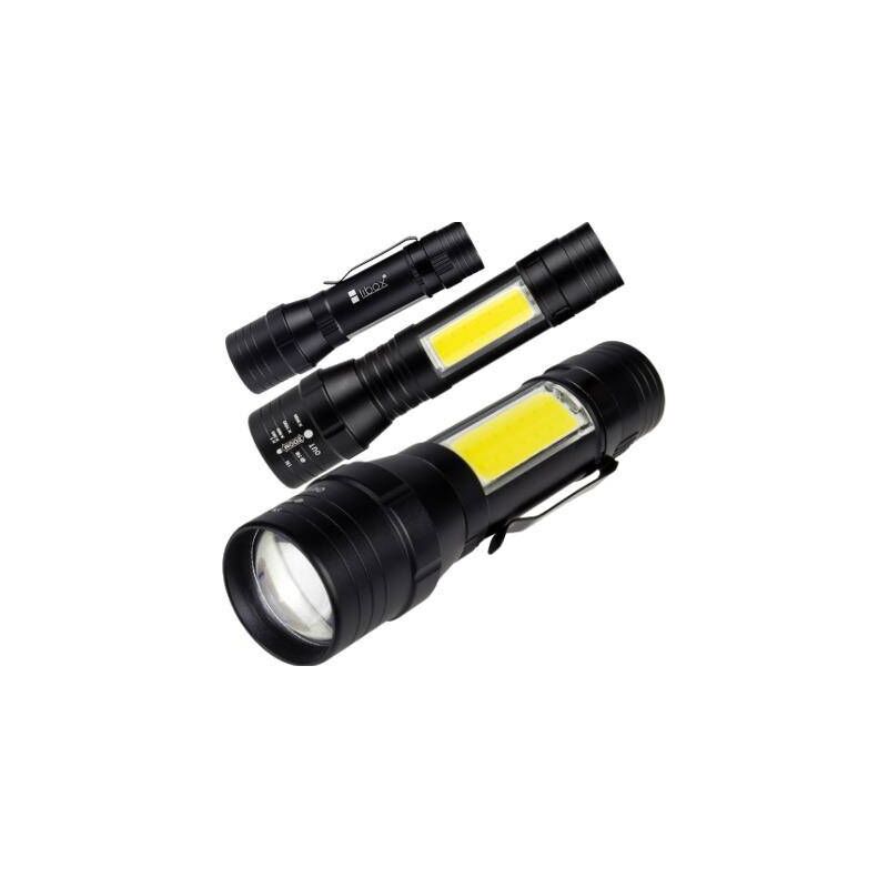 Alloggiamento robusto in alluminio aeronautico, resistente agli spruzzi d'acqua e alla pioggia, luce COB laterale con due livelli di potenza, funzione zoom ricaricabile tramite presa micro-USB, cavo di ricarica incluso. Perfetto per viaggi ed esplorazioni più lunghi! Specifica: Tipo di luce: COB LED xml - T6 5W Alloggiamento: Alluminio Potenza: 600 lumen Portata: 400 metri Alimentazione: 3,7 V, batteria agli ioni di litio 18650 (1200 mAh) Tempo di ricarica: 2 h Orario di lavoro: 3-4 h Dimensioni: 3,2x2,5x12-14 (cm)