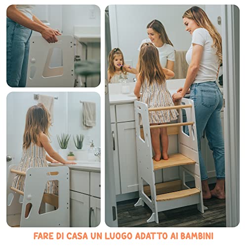 TORRE DI APPRENDIMENTO PER BAMBINI: I bambini a causa della loro bassa statura possono a volte sentirsi esclusi dalla vita familiare. La nostra torre di osservazione permetterà al tuo bambino di fare tutto come i grandi, partecipando alle attività quotidiane come cucinare o lavarsi i denti. La Montessori Learning Tower permette al bambino di essere all'altezza del piano di lavoro o del lavandino, consentendogli di diventare rapidamente indipendente.