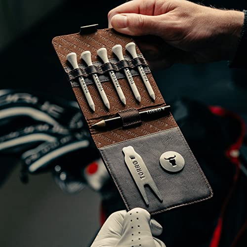 TORRO Set di Accessori da Golf - Portafoglio di Accessori da Golf in Vera Pelle, Incluso Strumento di Riparazione Divot in Metallo Spazzolato e Pennarello, 5 Tee da 70 mm e Matita (Marrone Oscuro)