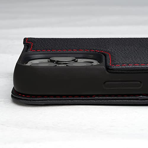 CARATTERISTICHE AGGIUNTIVE - La iPhone 14 Pro cover è dotata di 3 scomparti per carte di credito e di uno scomparto più grande per le note. Lo schermo è protetto da un bordo rialzato attorno al bordo della cornice per garantire che la copertina anteriore sia lontana dallo schermo per consentire l'inserimento di biglietti/note. La chiusura magnetica laterale garantisce una chiusura sicura pur mantenendo un profilo complessivamente sottile.