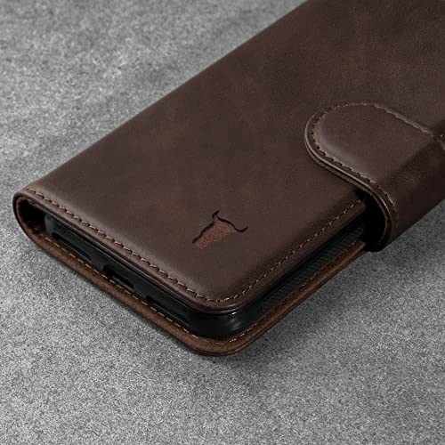 PELLE PREMIUM - TORRO custodia a portafoglio in Pelle Premium con funzione di supporto per iPhone SE 2a Generazione (2020), iPhone 8 e iPhone 7 è realizzata a mano in Vera Pelle Marrone Oscuro, proviene dagli Stati Uniti - la sua finitura profonda e ricca con dettagli preziosi nella venatura, conferisce a questo astuccio un aspetto ed una sensazione sofisticati ed eleganti.