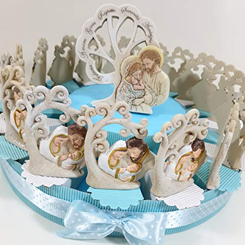 Torta Bomboniere battesimo sacra famiglia albero della vita, centrale e confetti (Torta 18 fette azzurro)