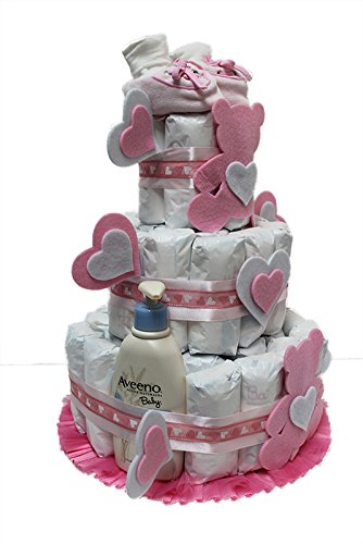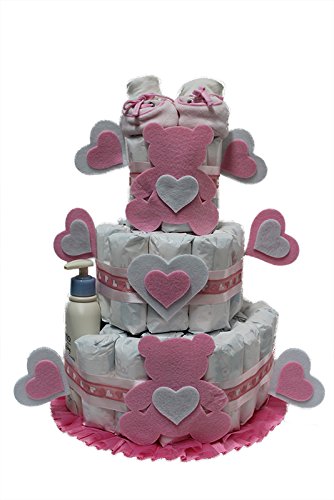 Torta di pannolini batuffi orsetti del cuore con scarpine e prodotti (rosa)
