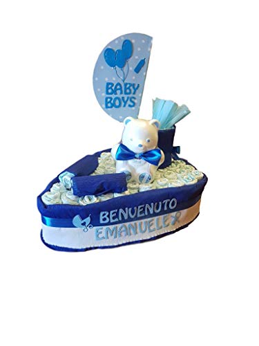 Torta di pannolini pampers con prodotti a forma di barca - barchetta di pannolini (azzurro)