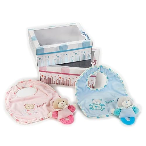 La Torta di Pannolini è disposta su 2 piani e comprende una morbida bavaglia della linea Zerotre di Venturelli e un giochino con massaggiagengive