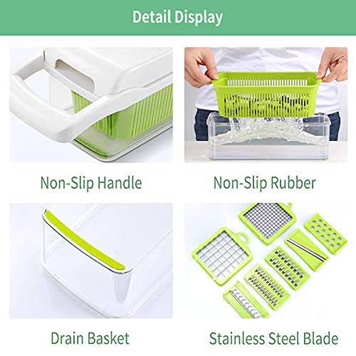 【SICUREZZA】Ci sono due linee antiscivolo nella parte inferiore del contenitore del utensile taglia verdure, che possono essere facilmente fissate sul tavolo della cucina, per aiutarti a risparmiare tempo e fatica,dotata di una scatola per riporre la lama, la lama può essere riposta in modo sicuro quando non viene utilizzata.