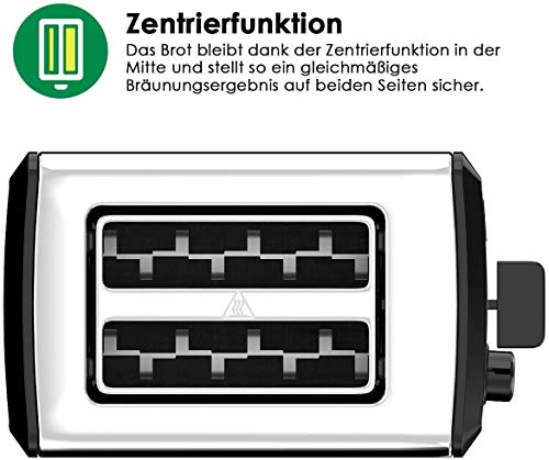 il tostapane a doppia fessura è realizzato in acciaio inossidabile di alta qualità e ha superfici lucide satinate, con contorni neri e un design chiaro - così un tostapane automatico con questi attributi si adatta in ogni cucina.