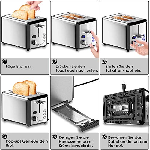 【 6 livelli di cottura & funzione di sollevamento automatico 】 il nostro tostapane in acciaio inox con la sua potenza di 800 W e 6 livelli per il grado di doratura desiderato;