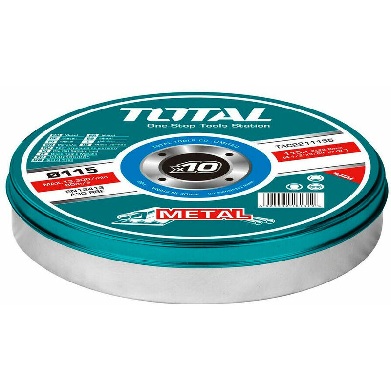 Disco da taglio in metallo TOTAL CARATTERISTICHE: Abrasivo legato con resina sintetica e rinforzato con tessuto in fibra di vetro Grani abrasivi in allumina estremamente tenaci garantiscono elevate prestazioni di taglio e una maggiore durata dell'utensile Set da 10 Dischi per Metallo e Inox Misure: 115x22,2mm Spessore lama: 1,2mm Con contenitore in metallo Prodotto di qualità LA FATTURA VIENE EMESSA PER IMPORTI SUPERIORI A € 20 E VA RICHIESTA AL MOMENTO DELL'ACQUISTO