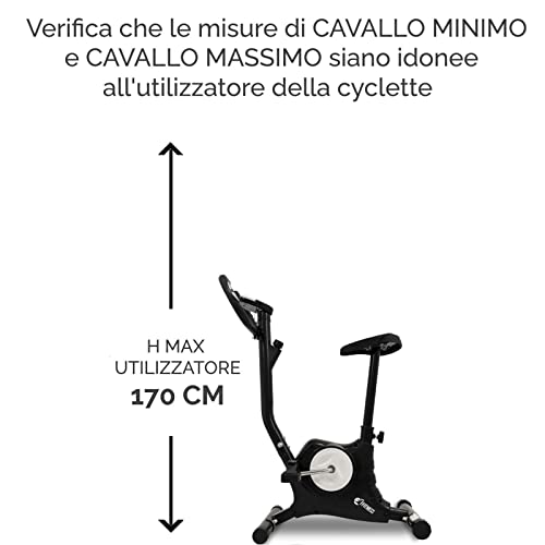 CYCLETTE: Misure: 41 x 62 x 102 cm - altezza cavallo: max 69 cm, min 41 cm - Peso massimo supportato: 100kg - Cardiofrequenzimentro INCLUSO - Sedile regolabile in altezza e resistenza regolabile con manopola (aggancio immediato e semplice dai cavi). Attrezzo indispensabile per l'allenamento di forza, resistenza, coordinazione e agilità