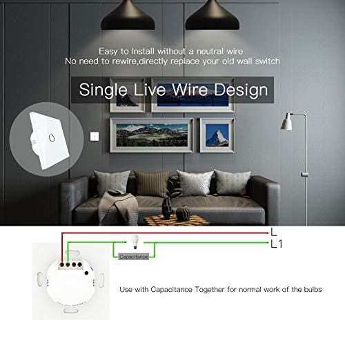 Moes WiFi Touch Wall Switch Nessun cavo neutro necessario Telecomando wireless Smart Single Wire 1 gang Interruttore a muro Lavora con Alexa Google Home