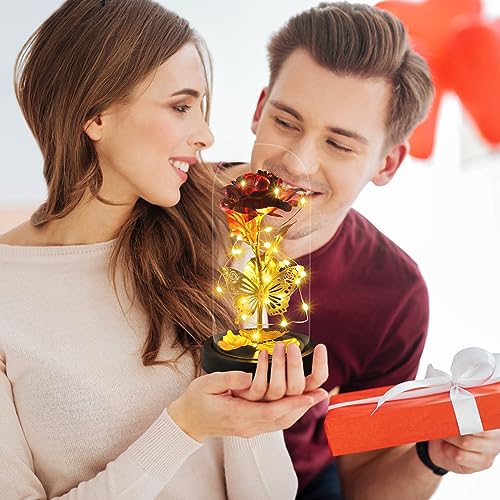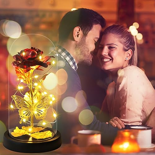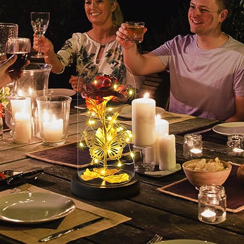 Regali perfetti per anniversario fiore rosa per mamme donne ragazze - Regalo unico e perfetto - Le minuscole luci a LED sono attorcigliate attorno alla rosa e ai petali caduti, che sono alimentati da 3 batterie AAA (non incluse). La luce calda non è aspra e ci regala un'atmosfera romantica, adatta per cene a lume di candela.