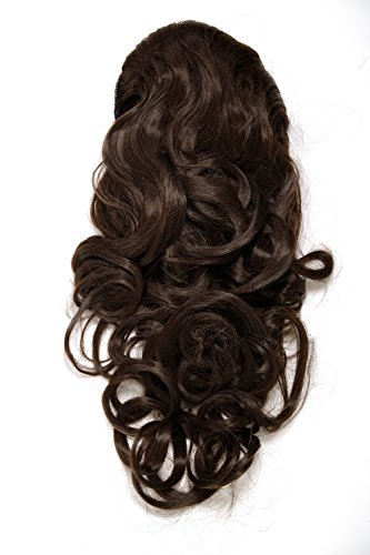 Toupet castano medio voluminoso dai magnifici ricci di fibra sintetica di qualità, che con un sistema composto da 2 fermacapelli a pettine e sezione elastica viene fermato ai propri capelli legati. L'extension viene fissata in modo sicuro e attaccata direttamente alla nuca.