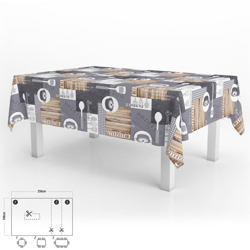 Cuisin Tovaglia Tela Cerata Rettangolare Impermeabile Antimacchia PVC 140 x 250 cm. Ritaglio per uso interno ed esterno - Misure: 140 x 250 cm. - Tovaglia in tela cerata stampata nei toni del grigio e del legno con forme di utensili da cucina. Design moderno ed elegante per ogni occasione. - Può essere facilmente tagliato o adattato a qualsiasi dimensione, per adattarlo a qualsiasi tipo di tavolo, superficie o mestiere. - Protegge il tavolo da schizzi, cadute, graffi e macchie. - È impermeabile e antiscivolo. - Forte e durevole, adatto sia per uso esterno che interno. - Realizzato in PVC e ricoperto di morbido feltro sul retro. - Si pulisce facilmente con un panno umido. - Non adatto per l'uso in lavatrice, asciugatrice o ferro da stiro. - Ideale per tavoli in soggiorno, cucina, sala da pranzo, terrazza o giardino. - Perfetto per proteggere mobili, tavoli o superfici, sia all'interno che all'esterno della casa. - Per ridurre le pieghe nella tovaglia, utilizzare un asciuga mani per