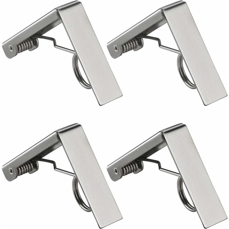 Clip per tovaglia a molla: la clip in metallo è composta dalla molla ad anello e dalla piastra metallica ad angolo retto, una maggiore flessibilità può prendere una presa salda delle tue tovaglie, mantenere le tovaglie in posizione nonostante il vento. Alta qualità- Il nostro set include 4 clip per tovaglie, realizzate in acciaio inossidabile, resistenti alla ruggine e durevoli, inoltre non rovineranno le tue tovaglie e non lasciano segni sulla tovaglia.tovaglia. Ampia applicazione: le clip per tovaglie in acciaio inossidabile ti consentono di svolgere attività all'interno e all'esterno, perfette per ristoranti, matrimoni, articoli vari per festival, picnic, feste.casa e feste, le tue tovaglie non verranno sfilate quando il vento o i bambini giocano. Design semplice: questa clip per tovaglia è facile da installare e rimuovere, l'elegante design a forma di rettangolo si abbinerà perfettamente ai vari stili di tovaglie. inoltre la bella rifinitura con il bordo liscio che è sicuro.