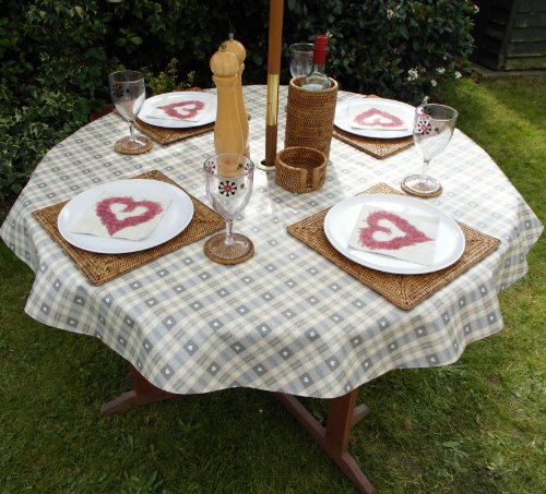 Tovaglia rotonda da 1,4 m in PVC/vinile, con cuori color grigio e panna, con foro per ombrellone