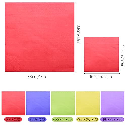 [100 Tovaglioli Arcobaleno] Riceverai 100 tovaglioli colorati, tra cui rosso, blu, verde, giallo, viola, 20 pezzi per colore, il numero e il colore sono sufficienti per te a scelta
