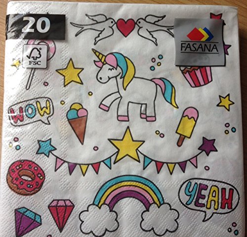 Tovaglioli di carta Fasana con unicorno, 20 pezzi, a 3 strati, piega 1/4, diversi soggetti, dimensioni:33 cm x 33 cm, tovaglioli stampati decorativi, con unicorno. Design10811