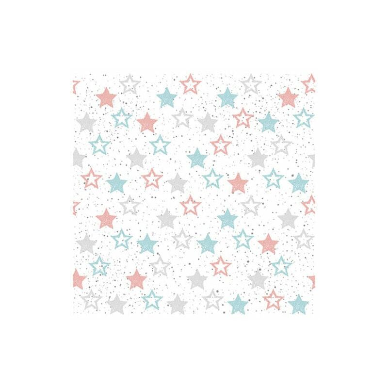 Tovaglioli di carta Stars All Over Petrol a 3 veli con tante stelline colorate su sfondo bianco.