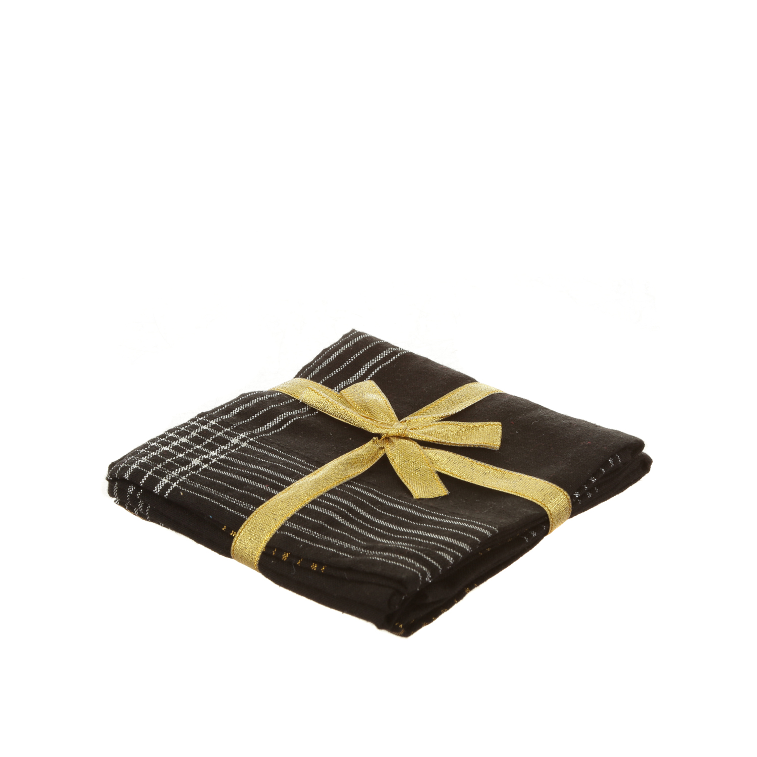 Abbina questi eleganti tovaglioli in tessuto alla loro tovaglia coordinata per dare vita a una mise en place coordinata e davvero unica. La scura trama nera è sdrammatizzata e resa luminosa dagli inserti metallici che creano incantevoli fili dorati. Un effetto scozzese davvero originale e raffinato, perfetto per le festività... che classe! I tovaglioli sono in misto cotone e lavabili in lavatrice a 30°. Misure: 40x40 cm.