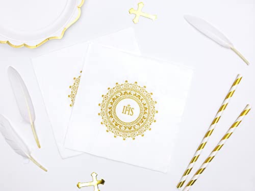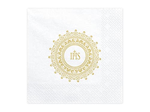 WYw - Set di 20 tovaglioli per la prima comunione cresima, decorazione per la tavola - IHS, 33 x 33 cm, bianco e oro