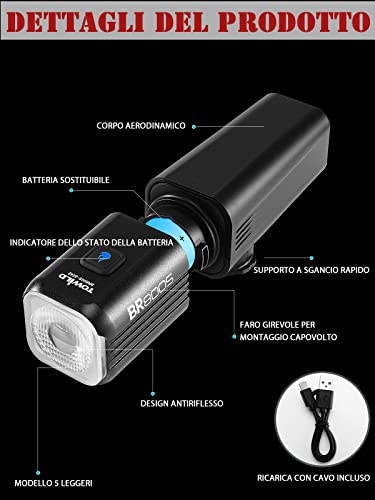 TOWILD Luci Bici 800 Lumen con Telecomando Wireless,Luci Bicicletta LED Batteria Sostituibile Integrata 2600 mAh Fari Luce Bici Anteriore Tipo C Ricaricabile Supporta l'installazione Inversa