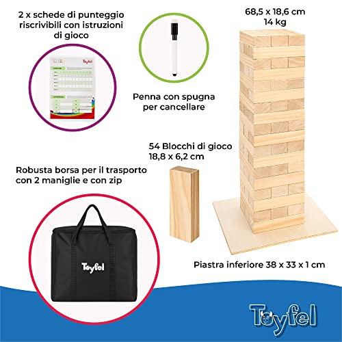 Toyfel Riski XXL Torre traballante 70 cm - Grande torre impilabile 54 pezzi in legno FSC® con base e tabellone punteggi - Eccitante gioco all'aperto per tutta la famiglia - torre vacillante