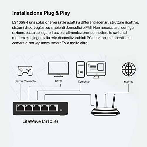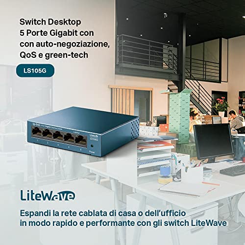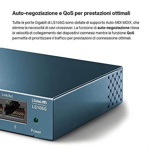 TP-Link LS105G Switch Ethernet 5 Porte Gigabit, Sdoppiatore Ethernet, Struttura in Metallo, 802.1p/DSCP QoS, Ideale per la Casa e il Ufficio, Plug & Play, Funzionamento Silenzioso, Montaggio Desktop
