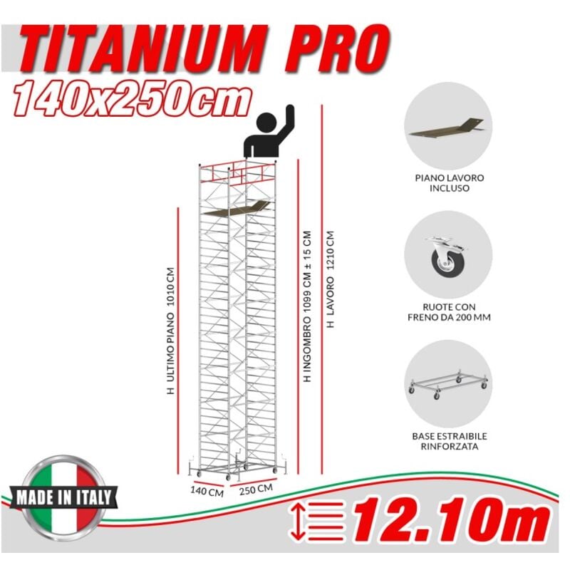 L' acquisto comprende 1 base estraibile rinforzata 250x140 cm (ingombro) 4 livellatori a pistone professionali a vite trapezoidale 8 campate h 120 cm (16 spalle + 16 correnti + 32 diagonali) 1 parapetto terminale h 120 cm (2 spalle + 4 DIAGONALI + 2 terminali) COLORE ROSSO INDICATIVO 1 piano in betulla fisso con telaio in acciaio zincato (250x52 cm) 1 piano in betulla con botola e telaio in acciaio zincato (250x52 cm) 4 ruote girevoli in gomma nera corredate di freno da 200 mm Il trabattello TITANIUM PRO è adatto per usi professionali, edilizia, manutenzioni civili ed industriali, settore elettrico. Facile da montare e smontare, è dotato di una base estraibile rinforzata in quattro pezzi ed è corredato di ruote da diametro 200 mm. Il piano di lavoro in legno è raggiungibile dall'interno attraverso una botola di passaggio. I piani di lavoro sono collegabili ogni 30 cm. I tiranti diagonali sono facilmente applicabili su appositi bussolotti alettati senza alcun uso di viti e bulloni. Il