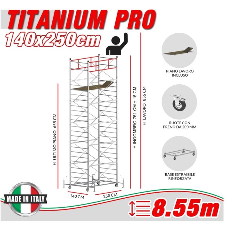 L' acquisto comprende 1 base estraibile rinforzata 250x140 cm (ingombro) 4 livellatori a pistone professionali a vite trapezoidale 5 campate h 120 cm (10 spalle + 10 correnti + 20 diagonali) 1 parapetto terminale h 120 cm (2 spalle + 4 DIAGONALI + 2 terminali) COLORE ROSSO INDICATIVO 1 piano in betulla fisso con telaio in acciaio zincato (250x52 cm) 1 piano in betulla con botola e telaio in acciaio zincato (250x52 cm) 4 ruote girevoli in gomma nera corredate di freno da 200 mm Il trabattello TITANIUM PRO è adatto per usi professionali, edilizia, manutenzioni civili ed industriali, settore elettrico. Facile da montare e smontare, è dotato di una base estraibile rinforzata in quattro pezzi ed è corredato di ruote da diametro 200 mm. Il piano di lavoro in legno è raggiungibile dall'interno attraverso una botola di passaggio. I piani di lavoro sono collegabili ogni 30 cm. I tiranti diagonali sono facilmente applicabili su appositi bussolotti alettati senza alcun uso di viti e bulloni. Il