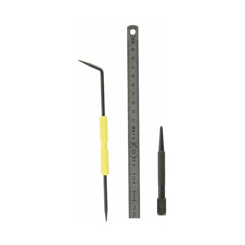Dettagli: Composto da 3 prodotti per il tracciamento: 1 righello in acciaio inox 200mm x 13mm graduato su un lato, 1 punzone a testa quadrata, 1 punta per il tracciamento.