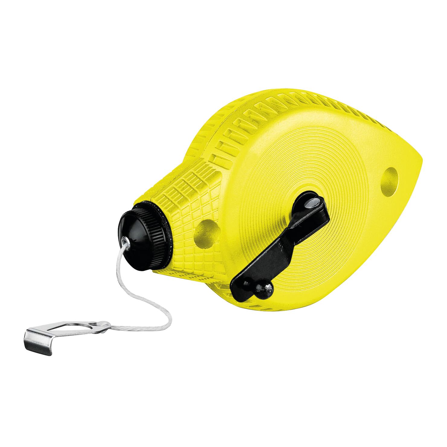 Tracciatore in alluminio, lunghezza filo 30m. Utilizzabile anche come filo a piombo. Manovella di riavvolgimento e bloccaggio del cordoncino a scomparsa. Regolazione della quantità di polvere in uscita