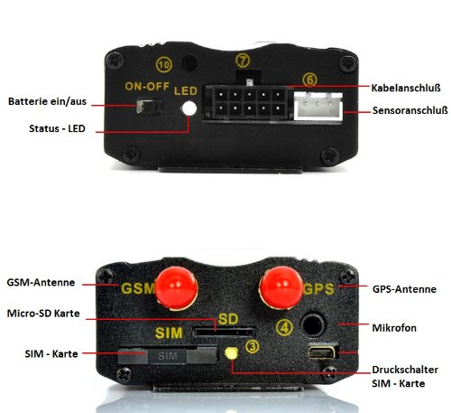Funzioni: ortung utilizzando il GPS e se non segnale GPS disponibile, per Net - allarme Allarme SOS, geo-recinto zona einrichtbar - allarme di velocità, allarme di movimento quando l' accensione, allarme quando avviso di batteria scarica - quando è collegato al sensore shock angeschlossen Shock - allarme quando chiusura centrale allarme quando porta apertura - Engine stop (stillegung auto per il furto), perdita di allarmi quando il serbatoio carburante (monitoraggio)