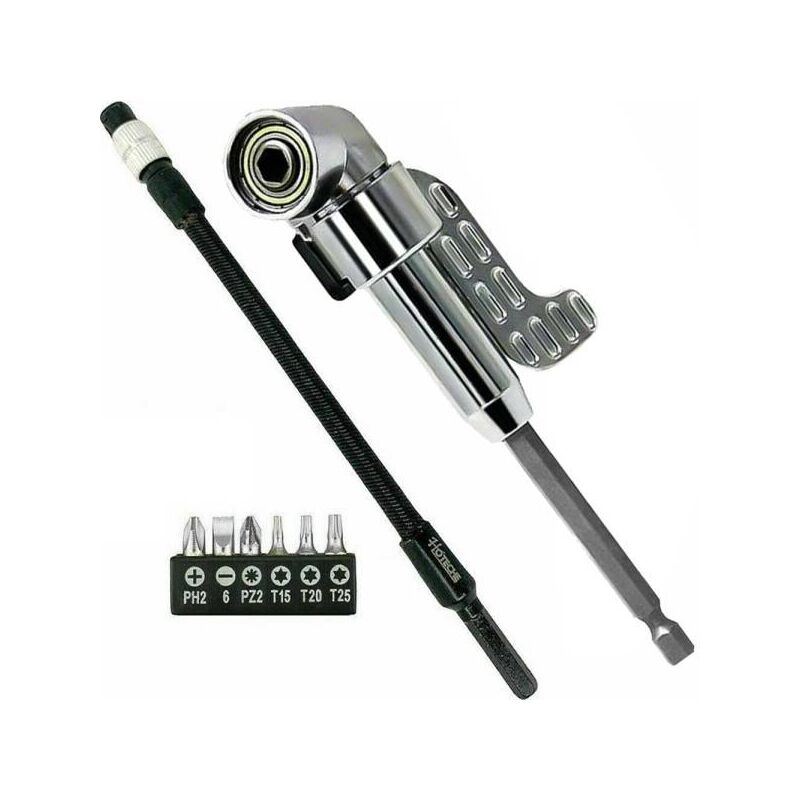 Adattatore angolare 105° per trapano mandrino angolare porta inserti flessibileComodissimo adattatore angolare a 105° per avvitatore/trapano, utile in zone dove il normale cacciavite dritto non può essere utilizzato o in quei spazi stretti dove l'avvitatore non entra. Nel kit ci sono 6 inserti con le impronte più comuni come, croce, taglio, torx. Incluso nel kit c'è un flessibile lungo 200 mm sempre da 1/4 di ulteriore utilità per spazi difficili da poter operare.Caratteristiche:Set 8 pz adattatore angolare per trapano attacco 1/4 prolunga flessibile 251030Porta punte angolare a 105° gradi per trapano avvitatore.Attacco 1/4Contenuto della confezioneAdattatore angolareProlunga flessibile da 200mm6 inserti PH2, 6, PZ2, T15, T20 e T25