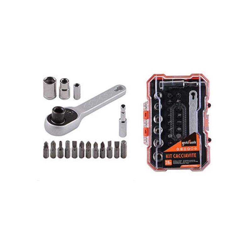 Pratico kit di cacciavite a cricchetto comodo da portare, infatti basta solo staccare la punta dal cacciavite ed inserirne un altra senza la necessità di portare con sé la cassetta degli attrezzi con tutti i cacciaviti ingombranti, potete inoltre regolare il cricchetto grazie al pulsante nero: a destra, sinistra o al centro per avere il classico cacciavite.SPECIFICHE TECNICHE:Teste esagonali da: 5 mm - 6mm - 7mm - 8mm -9mm - 10mmTeste: PH0 - PH1 - PH2 - PH3 - 4 - 5 - 6 - PZ0 - PZ1 - PZ3 - H3 - H4 - H5 - H6 - T10 - T15 - T20 - T25 - T30 - S2Adattatore 1/4