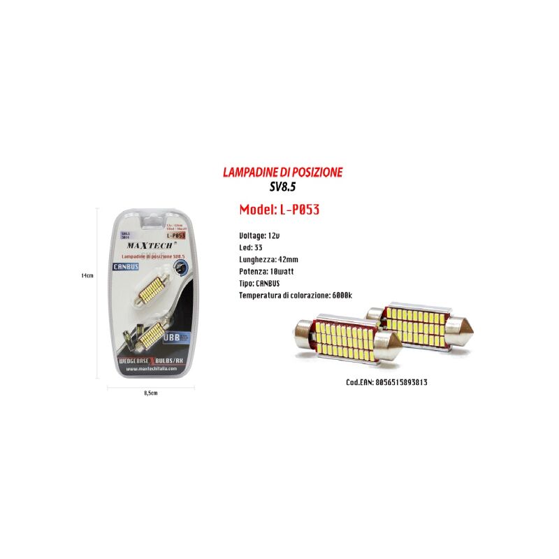 Lampadine di Posizione SV8.5 Canbus Maxtech L-P053 12V 42MM 33LED 10W 6000KBenvenuti nell'illuminazione del futuro! Hai mai desiderato trasformare la tua esperienza di guida con una luce più brillante e vivida? Le nostre lampadine di posizione SV8.5 Canbus Maxtech L-P053 sono qui per soddisfare ogni esigenza di illuminazione, portando l'innovazione direttamente sulla tua auto. Scopri come queste lampadine possono rendere ogni viaggio un'esperienza luminosa e sicura!Le lampadine di posizione SV8.5 Canbus Maxtech L-P053 sono il punto di riferimento per un'illuminazione superiore sulle strade. Progettate per garantire una visibilità ottimale e una lunga durata, queste lampadine offrono una potenza di 10W con una resa luminosa di 6000K, donando alla tua auto una luce bianca brillante che migliora la visibilità e l'estetica.Caratteristiche Principali:Tecnologia avanzata Canbus per una compatibilità senza problemi con la maggior parte delle auto moderne.33 LED di alta qualità per una