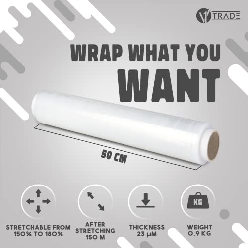 V1 Trade Film Estensibile Imballaggio 150m/50cm - Rotolo Pellicola Trasparente - Plastica per Imballaggio - Pellicola Imballaggio Trasloco