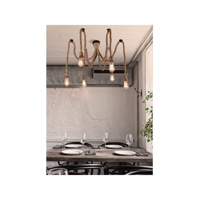Lampadario A Sospensione Dal Design Rustico Dotato Di 6 Corde In Canapa Naturale, La Cui Altezza Può Essere Regolata Ed Adattata Alle Proprie Esigenza. Perfetto Per Arredare Casa Con Originalità, Adatto Anche Per Decorazioni Di Bar, Pub, Ristoranti E Ovunque Si Desideri. Attacco: E27 (lampadine Non Incluse) Lunghezza Corde: 1200 Mm Diametro Base: 100 Mm Materiale: Metallo E Canapa Alimentazione: 240v Dotato Di 6 Corde In Canapa Naturale Potenza Max Lampadina 6x60w