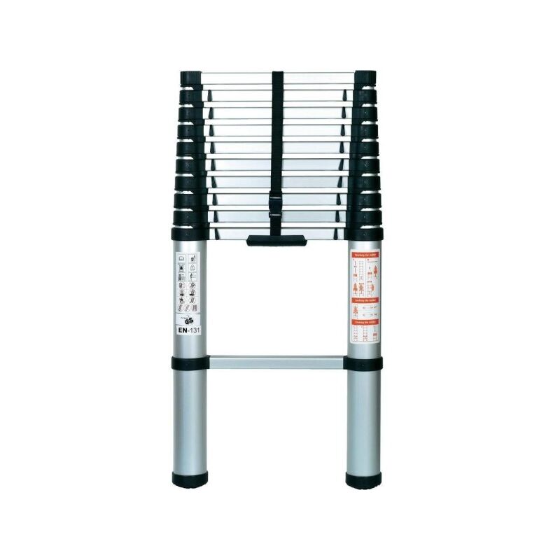 Scala telescopica ad apertura parziale o totale. Ideale per qualsiasi intervento all'esterno e all'interno.• Barre rettangolari in alluminio con scanalatura antiscivolo.• Montanti cilindrici scorrevoli in alluminio con blocco automatico di sicurezza su ogni sezione.• 2 leve di sblocco per ogni sezione.• Set di spessori da agganciare per evitare qualsiasi rischio per le mani.• Ingombro ridotto e leggerezza facilitano il trasporto e la sistemazione.• Carico max 150 kg.PRET13: Altezza: 95/380 cm.Larghezza: 49 cm.13 sbare.Peso 13 kg.