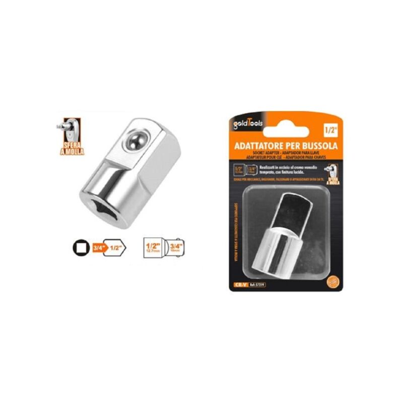 Adattatore per bussola con attacco quadro. Materiale in acciaio al cromo-vanadio temperato con finitura lucida con sfera a molla per il blocco nell'innesto. Ideale per meccanici, ingegneri, falegnami o affassionati di fai da te.Supporto per cuscinetti a sfera a molla. La finitura cromata lucida e brillante si pulisce facilmente e resiste alla corrosione.specifichefinitura: cromo lucidomateriale: acciaio al cromo-vanadio temperatoadattatore: 1/2(12.7mm) su 3/4(19mm)attacco bussola 1/2tipo di guida attacco quadrato 3/4contenuto:adattatore per bussola da 1/2