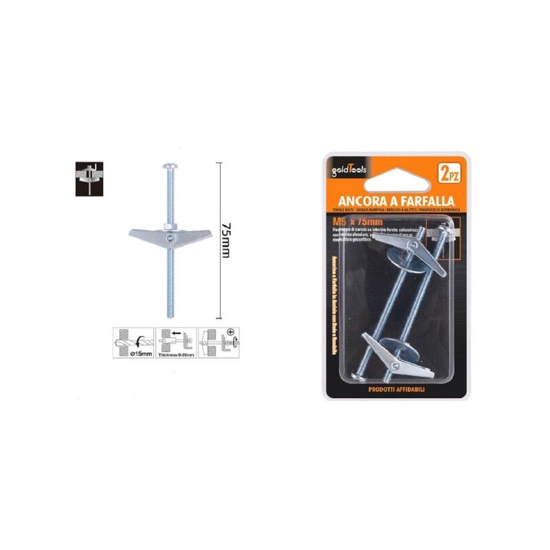 Ancora a farfalla dritta, sistema adatto al fissaggio di carichi su laterizio forato, calcestruzzo con anima alveolare, pannelli in lastre di gesso rivestito o di gessofibra. L'ancora a farfalla è prodotta in acciaio, materiale che consente un'ottima resistenza alla ossidazione ostacolando il formarsi della ruggine.Confezione: 2 PzMisura M5x75mm